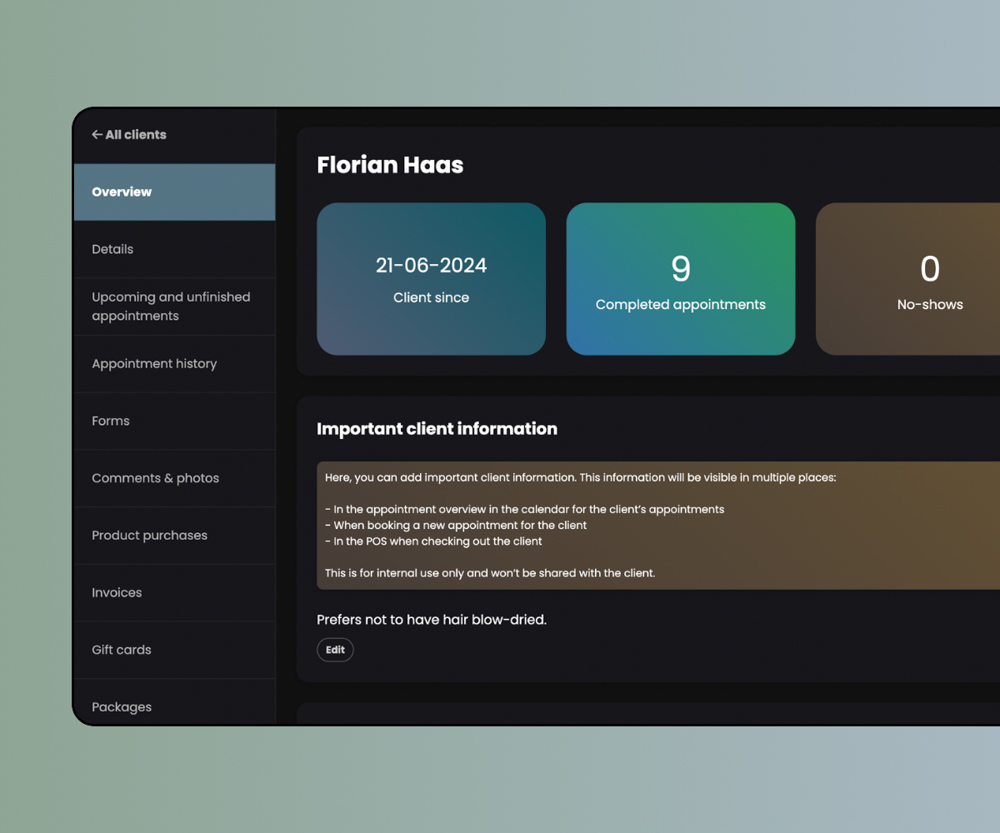 Add important client information that will be displayed in useful places - like when viewing an upcoming appointment for the client in the calendar. This ensures you always have the information when you need it.