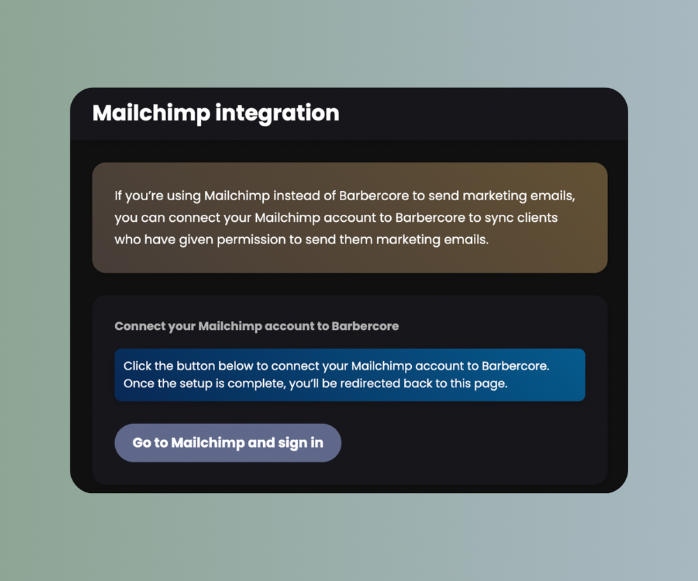 Using Mailchimp instead of Barbercore for your marketing emails? Easily connect your Mailchimp account to Barbercore and sync your client data automatically.