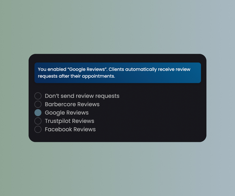 In addition to Barbercore Reviews, you can also automatically ask clients to leave a Google Review, Trustpilot Review, or Facebook Review after their appointment to boost your online reputation.