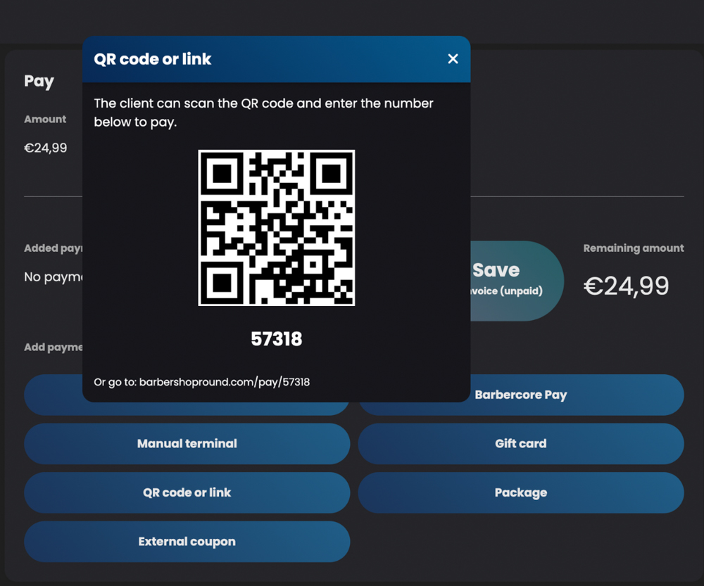 In addition to accepting card payments and cash, you can also let clients pay on their phone by letting them scan a QR code or open a payment link. It’s fully integrated, so once the payment is completed, you’ll instantly see that the payment has been completed in the POS system.